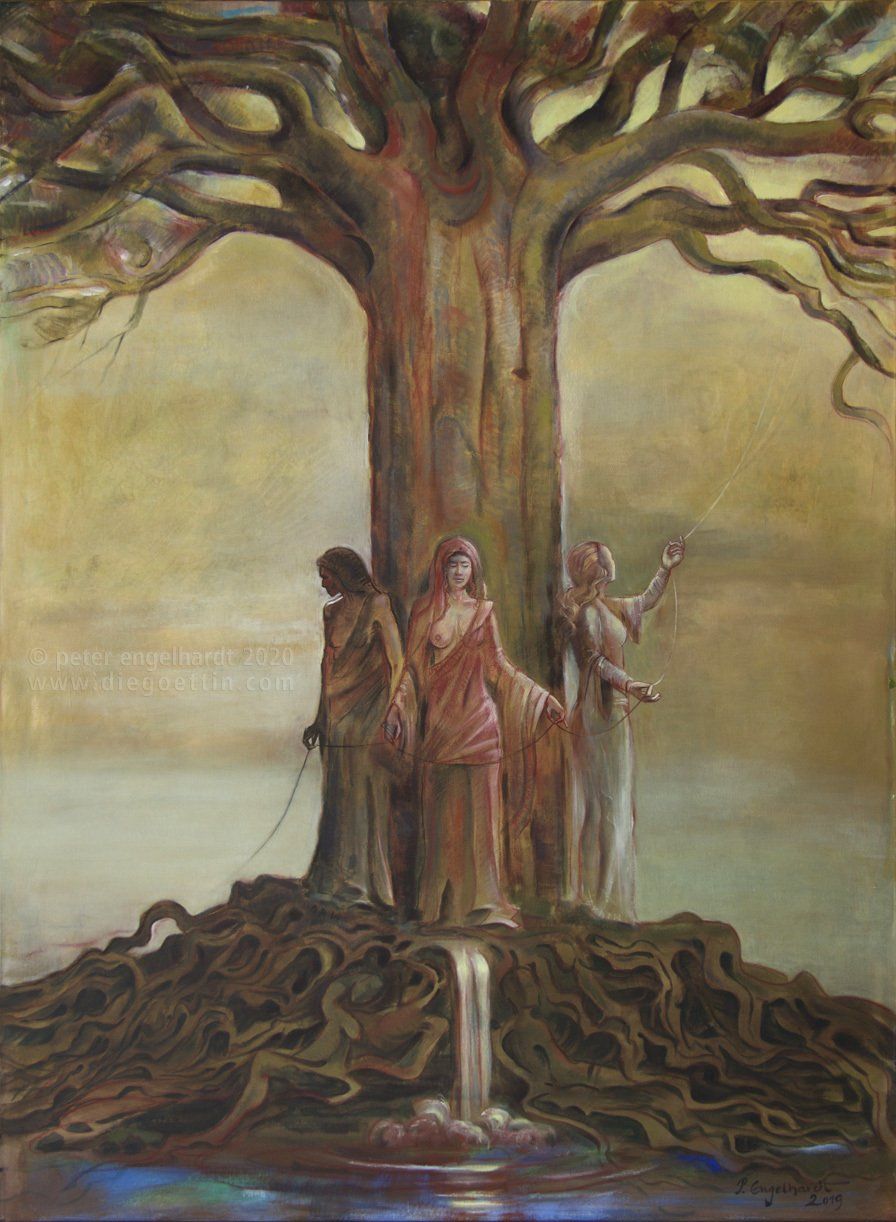 "Die Nornen II" Kohle, Rötel, Kreide u. Acrylfarben auf Leinwand 115 x 155 cm Die Nornen sind in der germanischen Mythologie die drei Göttinnen, welche den Lebensfaden der Menschen spinnen. Das Wyrd (althochdts. 'wurt', altnord. 'urðr') ist das große Gewebe, welches die Welt (als deren Teil der einzelne Mensch gesehen wurde) im Innersten zusammenhält - heute können sich wohl mehr Menschen unter dem Begriff "Matrix" etwas vergleichbares vorstellen. In ihrer Dreiheit entsprechen diese Göttinnen der Symbolik von Geburt - Reife - Tod oder Vergangenheit - Gegenwart - Zukunft. URD, VERDANDI und SKULD sind ihre Namen und jeder ist eine der drei Grundfarben des Lebens zugeordnet - Weiß, Rot und Schwarz.