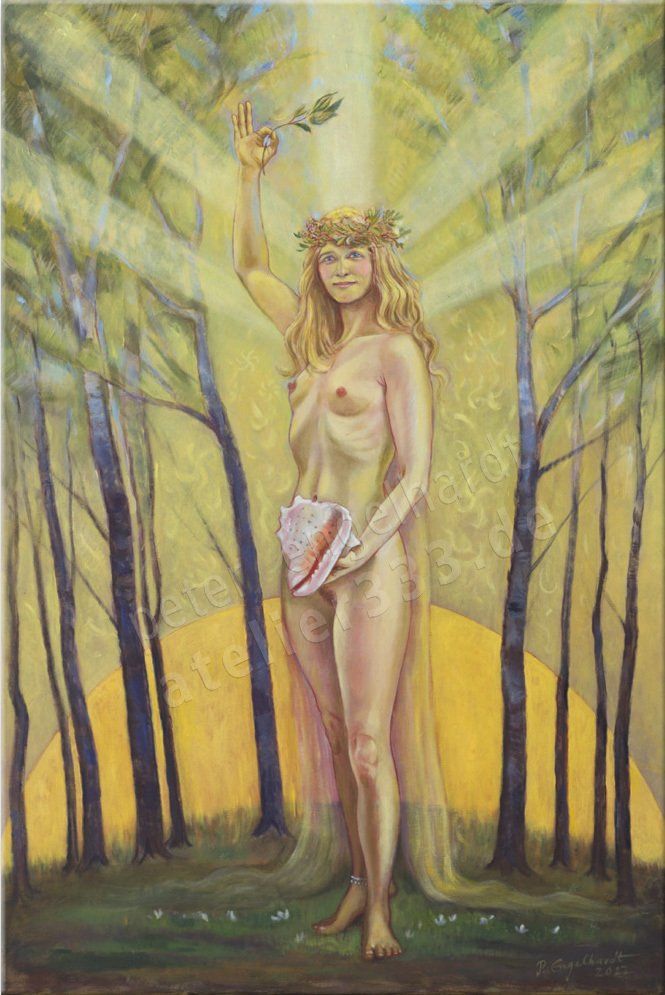 EOSTRE / Ostara, 2022, Acrylfarben auf Leinwand 80 x 120 cm EOSTRE / Ostara ist die germanische Göttin der Wiedergeburt - der zyklischen Wiedergeburt des Lebens im Frühling und der täglichen Wiedergeburt des Lichtes im Osten. Abwandlungen ihres Namens sind Eostre, Astarte, Ishtar, Eos. Der Wortwurzel verwandte Namen anderer, teilweise gleichbedeutender Göttinnen sind unter anderem das englische Eastre. Auch hierin steckt die Wortwurzel Osten / east. Die Göttinnen Ishtar (Göttin der Auferstehung) und Astarte wurden bei den indigenen Völkern des vorderen Orients verehrt und beinhalten ebenfalls die Wortwurzel für Osten / Neubeginn. Ostara ist in der germanischen Mythologie die Tochter von Frigg und Odin / Wotan. Von der Göttin Ostara leitet sich der germanische Monatsnamen für April - „Ostarmanoth“- ab. Das „Oster“-Ei ist das Symbol für die Kraftquelle neuen Lebens im Universum. Als die Farben der Ostara galten das Rosa, Rot und Gelb, das Goldrot des Sonnenaufganges, welcher seinerseits wiederum nichts anderes darstellt als ein Ursymbol des Neubeginns. Wie so oft überschneiden sich die Bedeutungsinhalte von Göttinnen verschiedener Regionen und Kulturen und ihre Wortwurzeln sind nicht selten miteinander verwandt. So sei hier die griechische Eos und die gleichbedeutende römische Aurora (beide Göttinnen der Morgenröte) genannt. In ihren Namen stecken die Worte für Osten (Eos) sowie für Gold (Aurum). Das Fest der Ostara fand beweglich entweder zum Frühlings-Aequinoctium am 21. März oder zum ersten Vollmond nach diesem Datum statt. Das der Ostara zugeordnete Tier ist der Hase - Symbol für die Vermehrung des Lebens. Ihr Baum ist die Eibe, woraus die Frau nach dem Glauben der Indigenen von den Göttern gemacht sei - Das Weibe aus der Eibe. Unsere indigenen europäischen Urahnen, Kelten, Germanen, Slawen, lebten in Harmonie mit der Natur und verehrten deren Wesen und deren Zyklen als göttlich. Viele ihrer Riten, Gebräuche und Jahreskreis-Feste wurden später von den Christen verboten oder - wo nicht anders möglich, in deren Sinne umfunktioniert bzw überlagert. So ist das ursprüngliche germanische Osterfest eine Feier der Wiederkehr des aufblühenden Lebens in der Natur, welches sich jedes Jahr erneuert und nicht etwa die eines angeblich auferstandenen Propheten eines patriarchal-monotheistischen Glaubenssystem.. Peter Engelhardt Die Nacht kehrte in ihr stilles Reich zurück; da erhob sich von ihrem rosigen Lager Ostara, die blühende Göttin des Morgens und des Frühlings und weckte mit ihrem Frührotschein die schlummernde Welt. (Wilhelm Wägner)