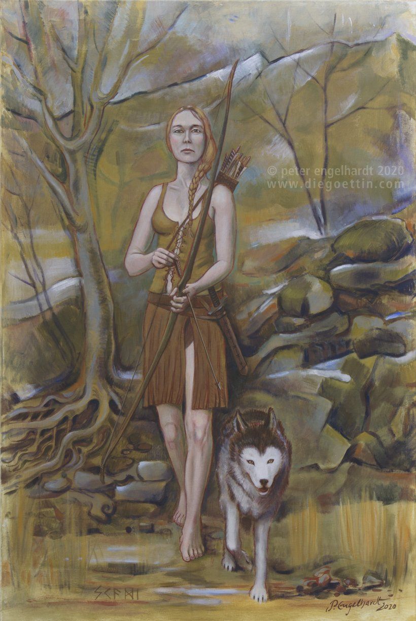"Skadi" Acrylfarben auf Leinwand 80 x 120 cm SKADI ist die germanische Göttin der Jagd und des Winters, nach der angeblich Skandinavien benannt wurde. Der Mythologie nach ist sie die Gattin des Gottes Njörðr. Während dieser aber als Gott des Meeres nur in seiner Heimstatt, dem Ort Nóatún am Meer glücklich ist, bevorzugt es SKADI in Thrymheimr zu weilen und in den Bergen zu jagen. Sie vereinbaren deswegen abwechselnd jeweils 9 Tage hier wie dort zu verbringen. Dennoch sollen die Götter Freyr und Freyja aus dieser Verbindung entsprungen sein. Nach ihrer Verbindung mit Njörðr soll SKADI der Sage nach noch Söhne mit dem Göttervater ODIN gezeugt haben. In älteren Überlieferungen soll sie auch mit dem Gott LOKI in einer Beziehung gestanden haben. Ihr Haupt-Attribut in der klassischen Mythologie ist der Jagdbogen, womit sich Ähnlichkeiten zur Göttin Artemis der Griechen bzw zur Göttin Diana der Römer ergeben. Auch an der Stellung der Göttin SKADI wird deutlich, welche Wertschätzung und Achtung und somit Freiheiten die Frau in der germanischen Kultur genoss bzw inne hatte. Sie entschied frei, mit welchem Mann sie die Ehe einging und wurde nicht zwangsverheiratet, um patriarchale Blutlinien und Machtansprüche zu sichern oder auszuweiten, wie dies später bei den (oft zwangs-)christianisierten Stämmen praktiziert wurde. In vorchristlicher Zeit war bei den indigenen Kelten und Germanen das Leben nach der matrilokalen Lebensform gestaltet - die Wohnstatt der Mutter blieb auch diejenige der Töchter und Enkelinnen. Privatbesitz und das Erzielen von Kapital aus diesem und entsprechende Verheiratungen zwecks Erweiterung des persönlichen Kapitals war den Germanen wie auch anderen indigenen lebenden Völkern unbekannt. Was die Natur dem Menschen gewährt, konnte nicht im Besitz eines Einzelnen sein - die Familie, der Stamm, die Gemeinschaft war höchste Priorität - alles wurde zu ihrem Wohl und Bestand eingerichtet. Dies änderte sich erst später über die Verbreitung der Religion des neuen EinMannGottes (als das Christentum bereits Staatsreligion der Römer war), dessen Klerus Feudalherren einsetzte, um „Gottes Land“ zu „verwalten“ und in Beschlag zu nehmen. Dies machte die indigenen, naturgläubigen Stämme, welche seit tausenden Jahren in Harmonie mit ihren Landgöttern und Naturwesen lebten, faktisch zu Sklaven einer neu aufoktroierten, kapitalistischen Gesellschaftstruktur. Die Landbevölkerung musste Schutzgelder in Form von „Steuern“ an die Feudalherren und Klöster abführen - nicht selten wurde ihr soviel abgenommen, dass ihr selbst nicht genug zum Leben blieb. Die Legende von Robin Hood, welcher als Symbol des sich innerhalb der Natur (des Waldes) autark lebenden Menschen gesehen werden kann, schildert anschaulich diese Zustände in einem totlitären Machtsystem, in welchen die Klöster und Landherren im Überfluß lebten, während die Landbevölkerung darbte. Man assoziiert unweigerlich erste mafiose Strukturen. Das Jagen in den Wäldern war nur dem „Besitzer“, dem Herrscher und seinem Gefolge erlaubt. Dem entrechteten Indigenen drohten empfindliche Strafen bis hin zur Todesstrafe, wenn er dessen Gesetzen keine Folge leistete und einfach von dem nahm, was die Natur allen Wesen gewährt. Durch die Christianisierung und die Übernahme der hierarchischen Strukturen dieses Glaubenssystems mit einem Herrscher an der Spitze des Dreiecks in die weltliche Politik, nahm eine verheerende Privatisierung der Erde zugunsten einiger Weniger ihren Anfang, die bis heute besteht und die erst überwunden werden kann, wenn das Bewusstsein über die Große Mutter, welche alle Wesen hervorbringt und ernährt, wieder in den Menschen auflebt und die Verehrung und Pflege der Erde oberste Priorität erlangt. Peter Engelhardt Unter anderem inspirierten mich zu meinen Bildern - Göttinnen, Naturwesen, indigene Kultur der Germanen und Kelten - die Bücher von Alexander A. Gronau, Bibliothek Nemeton, und das Buch „Die verlorene Göttin“ von Birgit Weidmann.
