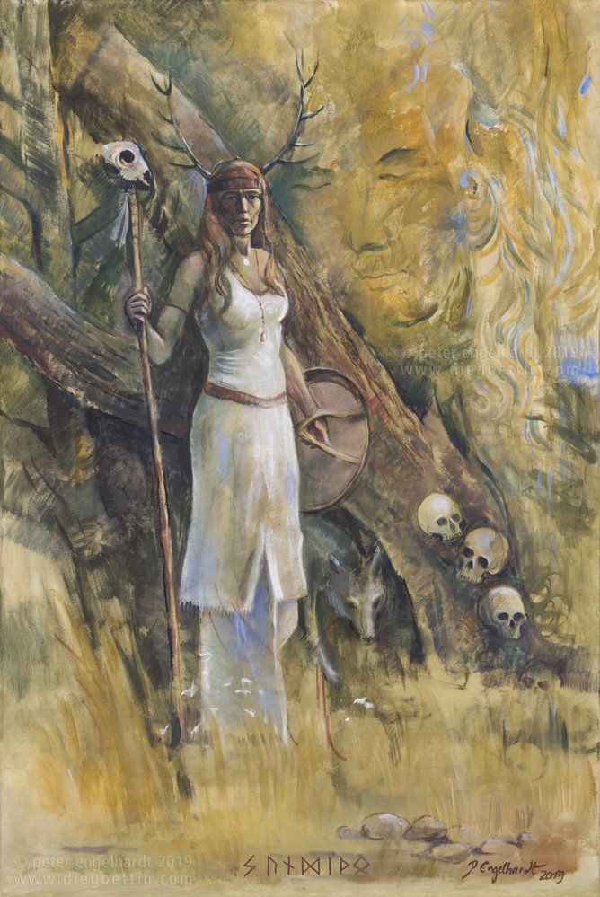 ALBRUNA (Die Seherin) Bei den indigenen Völkern Europas waren die Frauen dem Mann gleichgestellt. Worauf schon die Tatsache hindeutet, dass in der polytheistischen Naturreligion der Kelten, Germanen, Slawen und Balten unzählige weibliche Götter-, Elfen-, Feen- und Naturwesen die Welt unserer Urahnen bevölkerten. Der römische Schriftsteller Tacitus schrieb in seinem Buch über die Germanen: „…Sie glauben sogar, dass Frauen etwas Heiliges und Seherisches innewohnt, und deshalb weisen sie weder ihre Ratschläge ab, noch lassen sie ihre Weissagungen unbeachtet. …“ Völva ist die altnordische Bezeichnung für eine Seherin; die eigentliche Wortbedeutung ist „Stabträgerin“. Die Edda, die älteste Aufzeichnung von Versen, Gedichten und Liedern germanischer Mythologie und Religion beginnt mit der Völuspá, der Weissagung der Seherin: „Gehör erbitt ich aller heil’gen Geschlechter, höherer und mindrer Söhne Heimdalls; du willst, dass ich, Walvater, wohl erzähle älteste Kunde der Wesen, der ich mich erinnre.“ Albruna war eine berühmte germanische Seherin. Tacitus schreibt über sie: „Wir haben es unter dem seligen Vespasian erlebt, dass Veleda bei Vielen lange göttlichen Platz einnahm; aber auch schon lange vorher wurden Albruna und einige andere verehrt, aber nicht durch Kriecherei oder als ob sie sie etwa erst zu Göttinnen machten.“ Albruna war auch der Name einer Göttin der Morgenröte. Die Morgenröte wiederum ist Symbol des aufkommenden Lichtes, welches die Dinge erst sichtbar macht. So ist auch hier der Zusammenhang zwischen dem Sehen und dem Weissagen (lat. albus - weiß, germ. Runa - Wissen, Weisheit) wiederholt gespiegelt. Albruna verkörpert das Wissen und die Weisheit (die mit der Weisheit der Alben/Elben Versehene). Bekannt durch die Überlieferungen römischer Schriftsteller ist weiterhin, dass die Germanen keine Beschlüssen entgegen den Ratschlägen ihrer weisen Frauen fassten. Nach der Ausbreitung des Christentums in Europa wurden diese weisen Frauen, welche mit der Gabe des „zweiten Gesichtes“ ausgestattet waren, genau wie die heilkundigen Frauen und Priesterinnen der Germanen als „Hexen“ verfolgt und mit ihnen auch das Wissen um die Heilkräfte der Pflanzen und des natürlichen Lebens nahezu ausgerottet. Peter Engelhardt Dank an Birgit Weidmann für die Inspirationen durch ihr Buch „Die verlorene Göttin“