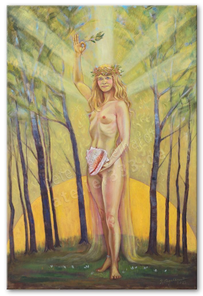 EOSTRE / Ostara, 2022, Acrylfarben auf Leinwand 80 x 120 cm EOSTRE / Ostara ist die germanische Göttin der Wiedergeburt - der zyklischen Wiedergeburt des Lebens im Frühling und der täglichen Wiedergeburt des Lichtes im Osten. Abwandlungen ihres Namens sind Eostre, Astarte, Ishtar, Eos. Der Wortwurzel verwandte Namen anderer, teilweise gleichbedeutender Göttinnen sind unter anderem das englische Eastre. Auch hierin steckt die Wortwurzel Osten / east. Die Göttinnen Ishtar (Göttin der Auferstehung) und Astarte wurden bei den indigenen Völkern des vorderen Orients verehrt und beinhalten ebenfalls die Wortwurzel für Osten / Neubeginn. Ostara ist in der germanischen Mythologie die Tochter von Frigg und Odin / Wotan. Von der Göttin Ostara leitet sich der germanische Monatsnamen für April - „Ostarmanoth“- ab. Das „Oster“-Ei ist das Symbol für die Kraftquelle neuen Lebens im Universum. Als die Farben der Ostara galten das Rosa, Rot und Gelb, das Goldrot des Sonnenaufganges, welcher seinerseits wiederum nichts anderes darstellt als ein Ursymbol des Neubeginns. Wie so oft überschneiden sich die Bedeutungsinhalte von Göttinnen verschiedener Regionen und Kulturen und ihre Wortwurzeln sind nicht selten miteinander verwandt. So sei hier die griechische Eos und die gleichbedeutende römische Aurora (beide Göttinnen der Morgenröte) genannt. In ihren Namen stecken die Worte für Osten (Eos) sowie für Gold (Aurum). Das Fest der Ostara fand beweglich entweder zum Frühlings-Aequinoctium am 21. März oder zum ersten Vollmond nach diesem Datum statt. Das der Ostara zugeordnete Tier ist der Hase - Symbol für die Vermehrung des Lebens. Ihr Baum ist die Eibe, woraus die Frau nach dem Glauben der Indigenen von den Göttern gemacht sei - Das Weibe aus der Eibe. Unsere indigenen europäischen Urahnen, Kelten, Germanen, Slawen, lebten in Harmonie mit der Natur und verehrten deren Wesen und deren Zyklen als göttlich. Viele ihrer Riten, Gebräuche und Jahreskreis-Feste wurden später von den Christen verboten oder - wo nicht anders möglich, in deren Sinne umfunktioniert bzw überlagert. So ist das ursprüngliche germanische Osterfest eine Feier der Wiederkehr des aufblühenden Lebens in der Natur, welches sich jedes Jahr erneuert und nicht etwa die eines angeblich auferstandenen Propheten eines patriarchal-monotheistischen Glaubenssystem.. Peter Engelhardt Die Nacht kehrte in ihr stilles Reich zurück; da erhob sich von ihrem rosigen Lager Ostara, die blühende Göttin des Morgens und des Frühlings und weckte mit ihrem Frührotschein die schlummernde Welt. (Wilhelm Wägner)